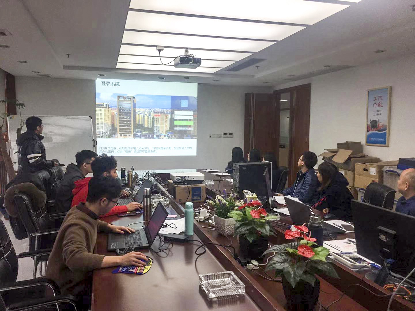 培訓中,技術員詳細介紹了協同辦公系統用戶操作技能,現場演示了工作處理單的操作流程。培訓人員認真聽講,并就協同辦公系統操作事項與技術員展開了溝通與交流。