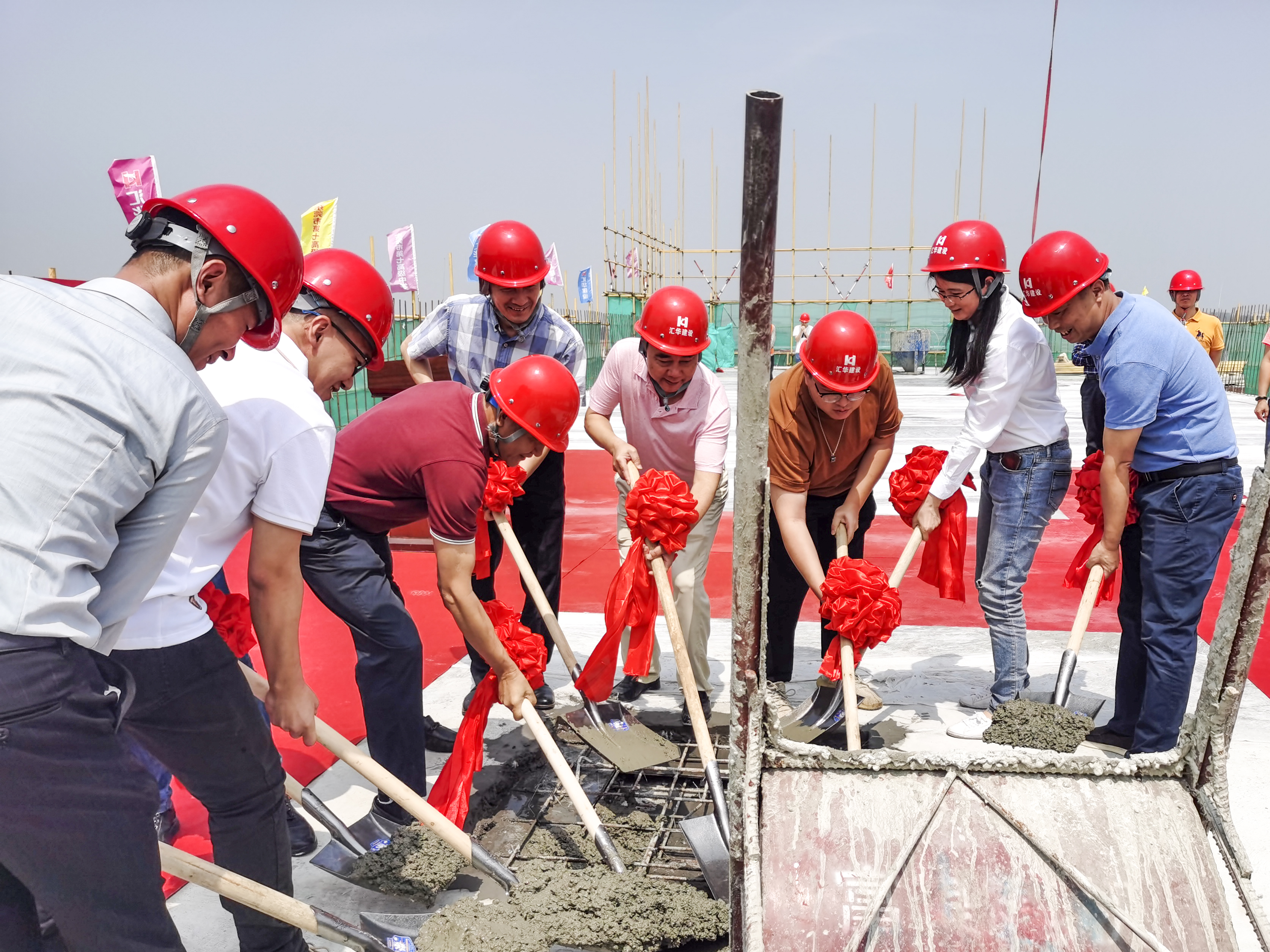 (封頂儀式現場) 東莞市城建局調研員馬文標先生、東莞市第七高級中學校長段文宏先生、廣東匯華建設集團有限公司董事長麥照華先生等領導先后致辭,隨后與廣東匯華建設集團有限公司副總經理廖志峰先生等領導一起出席封頂儀式。